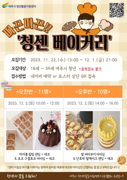 [금요저널] 여주시 청년활동지원센터는 오는 12월, 여주시 청년들을 위한 ‘따끈따끈 청센 베이커리’ 프로그램을 진행한다고 밝혔다.
