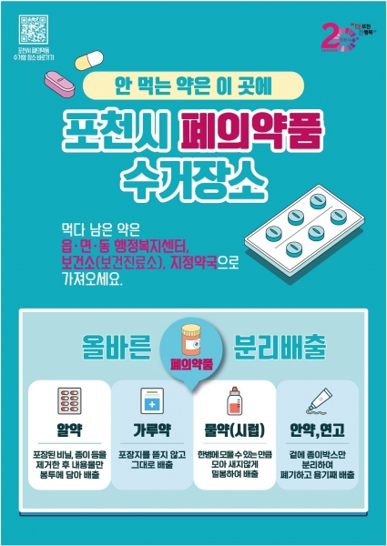 [금요저널] 포천시는 지난 20일 행정복지센터 및 약국 등 폐의약품 수거함 비치 장소에 ‘폐의약품 수거장소 및 올바른 배출방법’을 알리는 포스터와 스티커를 제작해 부착했다고 밝혔다.