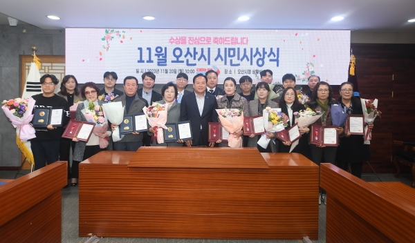 [금요저널] 오산시는 지난 20일 시청 상황실에서 지역사회 발전을 위해 헌신하고 노력한 시민들에게 감사의 마음을 전하기 위해 11월 시민시상식을 개최했다.