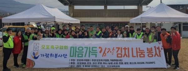 [금요저널] 오포축구협회는 지난 19일 오포생활체육공원에서 ‘마음가득 김장 김치 나눔’ 행사를 개최, 김장 김치 120박스를 오포 4개 동 행정복지센터에 기탁했다.