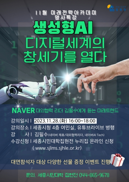 이홍준 자치행정국장은 “기존 콘텐츠의 패턴을 학습해 새로운 콘텐츠를 만들어 내는 생성형 인공지능이 미래사회를 주도할 것”이라며 “이번 강연을 통해 시민들이 미래사회를 미리 경험해 보는 기회를 갖길 바란다”고 말했다.