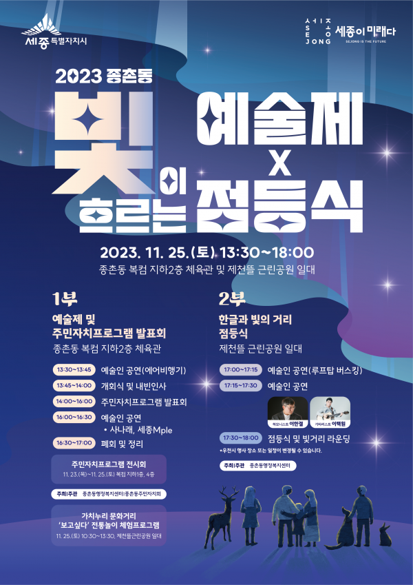 [금요저널] 세종특별자치시 종촌동이 오는 25일 ‘2023 종촌동 빛이 흐르는 예술제 및 점등식’을 개최한다.