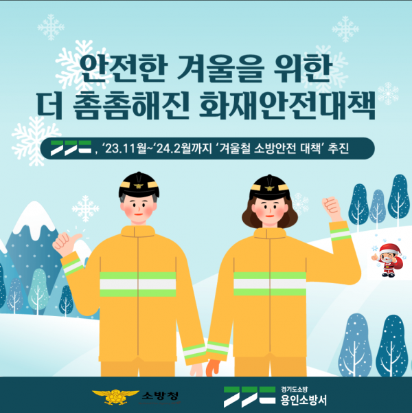 [금요저널] 용인소방서는 매서운 겨울 따듯하게 보내기를 바며 내년 2월까지 4개월간 ‘겨울철 화재안전대책’을 추진한다고 23일 밝혔다.