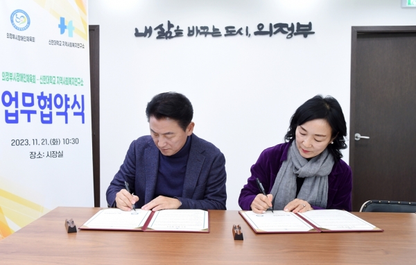 [금요저널] 의정부시는 의정부시장애인체육회가 11월 21일 시청 시장실에서 신한대학교 경기북부개발원 지역사회복지연구소와 상호협력과 발전을 위한 업무협약을 체결했다고 밝혔다.