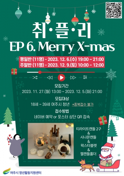 [금요저널] 여주시 청년활동지원센터는 오는 12월, 크리스마스를 기념해 여주시 청년들을 위한 ‘취미플레이리스트 MERRY X-MAS’ 프로그램을 진행한다고 밝혔다.
