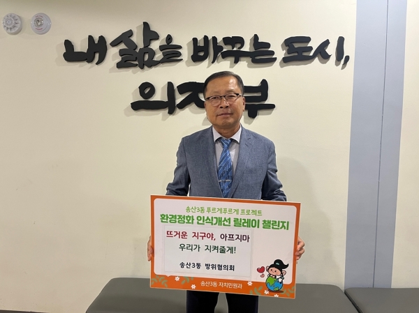 챌린지의 아홉 번째 주자인 이호철 송산3동 방위협의회장은 ‘뜨거운 지구야, 아프지마 우리가 지켜줄게’라는 문구로 챌린지에 참여해 이웃들에게 환경에 대한 관심을 촉구했다.
