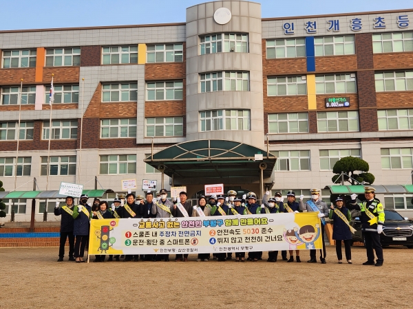 [금요저널] 부평구는 지난 23일 인천개흥초등학교에서 등굣길 어린이와 통행 운전자를 대상으로 교통안전 캠페인을 실시했다.