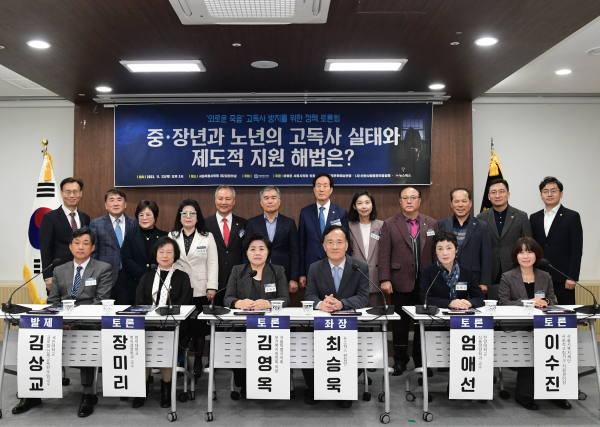 발제자로는 김상교 세한대학교 글로벌인재교육원 교수가 ‘중·장년과 노년의 고독사 줄이기’라는 주제로 발표했고 토론에는 김영옥 서울특별시의회 보건복지위원회 위원, 엄애선 한양대학교 식품영양학과 교수, 장미리 명지대학교 복지경영학과 교수, 이수진 서울시복지재단 사회적고립가구 지원센터장이 참여해 열띤 논의를 이어갔다.