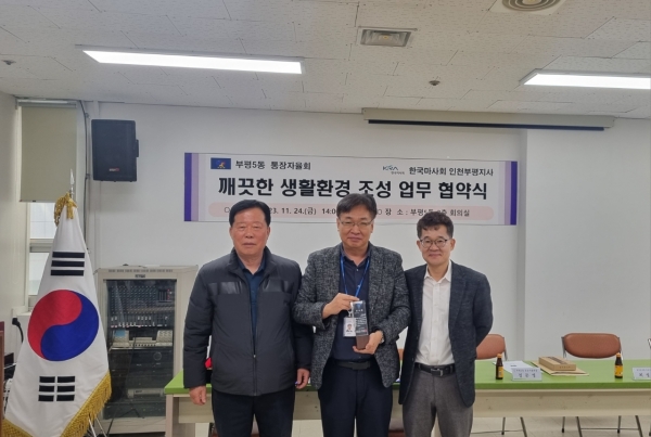 [금요저널] 부평구 부평5동 통장자율회는 지난 24일 동 행정복지센터에서 깨끗한 부평5동 생활환경 조성을 위한 상호 협력 체계를 구축하기 위해 한국마사회 인천부평지사와 업무협약을 체결했다.