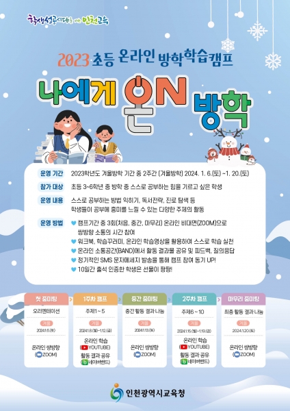 [금요저널] 인천광역시교육청은 겨울방학 기간 기초학력보장 지원을 위한 초등 온라인 방학학습캠프 ‘나에게 온 방학’ 참가자를 12월 8일까지 모집한다.