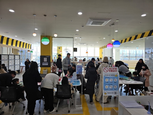 체험 부스에는 마을동아리 6팀이 참가해 뱃지 꾸미기 언플러그드 코딩 체험 영어퀴즈 맞추기 슈링클스 만들기 복주머니 브로치와 머리끈 만들기 프로그램을 운영했다.