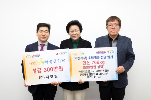[금요저널] 대한한돈협회 이천지부 조창근 지부장, ㈜지코빌 윤기안 대표가 지난 23일 이천시청에서 행복한 동행 기탁식에 참여해 한돈 769kg와 성금 300만원을 기탁하며 변함없는 나눔의 손길을 내밀었다.