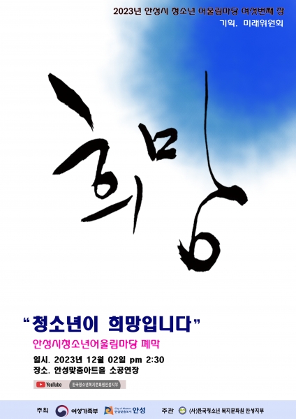 [금요저널] ‘희망’을 부제로 청소년들의 다양한 끼와 재능을 발휘하게 될 2023안성시청소년어울림마당 폐막식이 오는 12월 2일 오후 2시 30분 안성맞춤아트홀 소공연장에서 펼쳐진다.