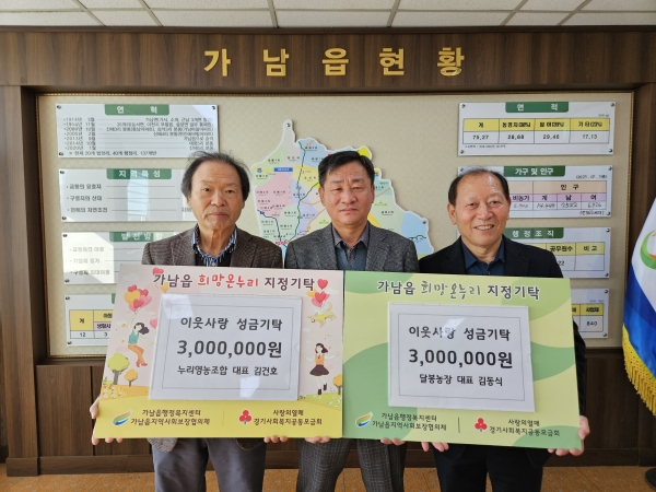 이복환 가남읍장은 “지난해에 이어 관내 취약계층을 위해 성금을 기탁 해 주신 두 분에게 진심으로 감사드리며 도움이 필요한 우리 이웃들이 따뜻한 겨울을 보낼 수 있도록 소중히 사용하겠다”고 말했다.