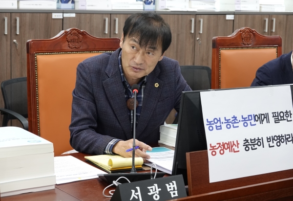 서광범 의원은 “가축분뇨 처리는 축산농가의 가장 큰 애로사항임에도 이를 지원하기 위한 악취저감사업은 큰 폭으로 예산이 삭감됐고 양돈농가 미생물제 지원사업은 아예 일몰시켰는데 이는 축산농가를 돕지 않겠다는 것”이라고 질책했다.