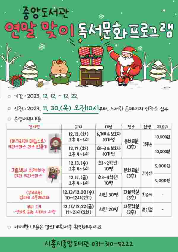 연말 맞이 강좌는 시흥시중앙도서관에서 대면 강좌로 진행되며 오는 11월 30일 오전 10시부터 시흥시중앙도서관 누리집을 통해 신청할 수 있다.
