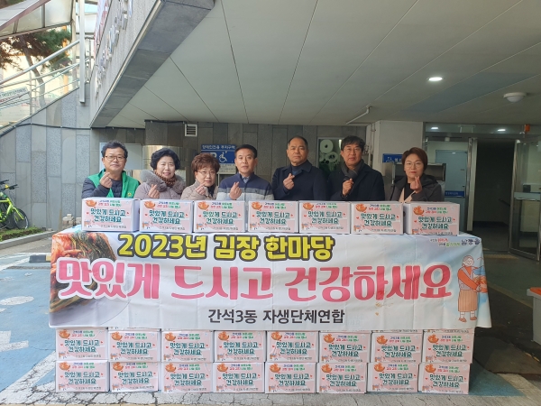 이번 김장 나눔 행사는 간석3동 주민자치회, 통장협의회, 방위협의회, 지역사회보장협의체, 새마을협의회, 새마을부녀회, 바르게살기위원회, 자유총연맹위원회, 자율방범대, 간석시장 상인회, 의용소방대 등 11개 자생 단체가 참여해 동절기 취약계층 272세대에 김장김치 2,720kg을 전달했다.