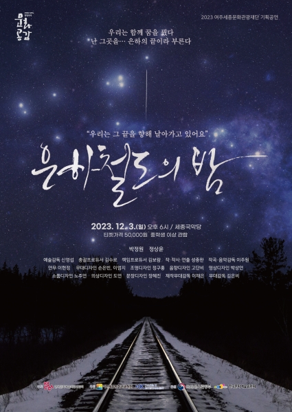 [금요저널] 여주세종문화관광재단이 오는 12월 3일 한국문화예술회관연합회 지원사업인 ‘2023 문예회관과 함께하는 방방곡곡 문화공감 사업’의 일환으로 뮤지컬‘은하철도의 밤’을 세종국악당에서 개최한다.