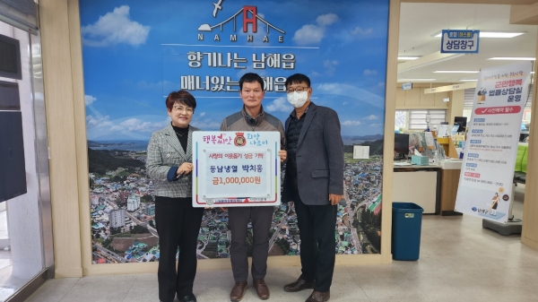 [금요저널] 동남냉열 박치홍 대표는 29일 남해읍행정복지센터를 방문해 관내 생활이 어려운 청소년 복식 유망주 2 가구에 각 50만원을 지원해 달라며 이웃돕기 성금 100만원을 기탁했다.