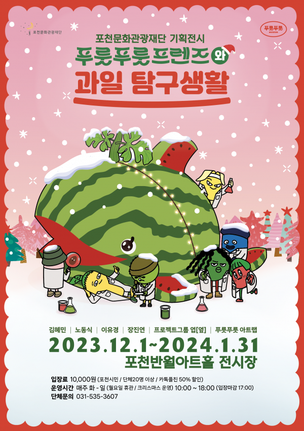 [금요저널] 포천문화관광재단은 1일부터 2024년 1월 31일까지 포천 반월아트홀 전시장에서 푸룻푸룻프렌즈와 과일탐구생활 전시를 개최한다고 밝혔다.