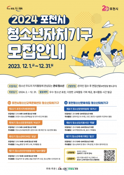 [금요저널] 포천시는 포천시 공공 청소년수련시설에서 12월 1일부터 12월 31일까지 ‘2024년 포천시 청소년자치기구’ 참가 청소년을 모집한다고 밝혔다.