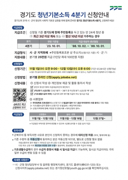 청년기본소득은 분기별 25만원씩 1인당 연 100만원이 카드형 지역화폐로 지원되며 경기도 일자리지원사업 통합접수시스템 잡아바에 11월 1일 이후 발급한 주민등록초본을 첨부해 신청할 수 있다.