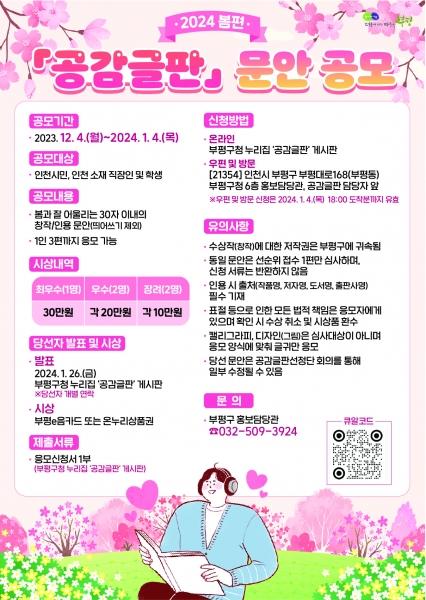 [금요저널] 부평구가 오는 4일부터 다음 달 4일까지 한 달간 ‘2024년 봄편 공감글판’ 문안을 공모한다.