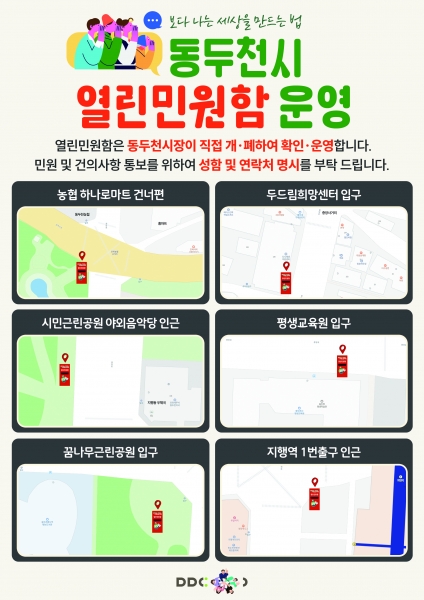 [금요저널] 동두천시는 시민 소통행정을 위해 유동 인구가 많은 곳에 열린민원함 6개를 설치해 12월 1일부터 운영한다.