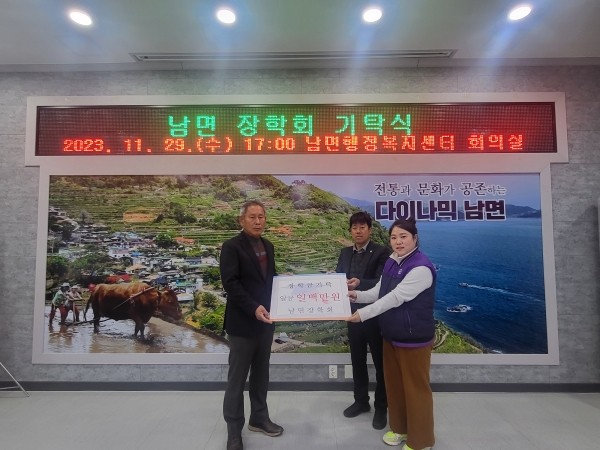 [금요저널] 남해군 남면장학회는 29일 우리은행 본점 김정태 과장과 CU 남해 남면점 이선아 대표가 지역인재 육성을 위한 장학금을 기탁했다고 밝혔다.
