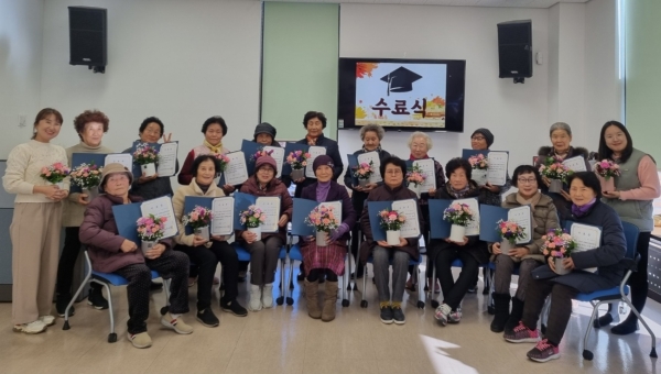 이번 수료식에는 도립거창대학교 간호학과 학생들이 어르신과 생화 꽃꽂이를 함께하며 더욱 활기찬 분위기 속에서 유종의 미를 거뒀다.