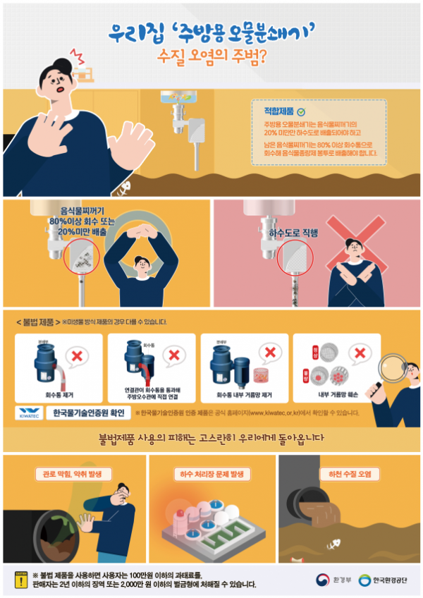 주방용 오물분쇄기는 가정에서 발생하는 음식물찌꺼기를 분쇄해 오수와 함께 하수관으로 배출시키는 제품으로 사용자는 분쇄한 음식물의 20% 미만만 공공하수도로 배출하고 80% 이상은 사용자가 반드시 회수통으로 회수해 음식물 종량제 봉투나 용기로 배출하는 인증된 제품을 사용해야 한다.