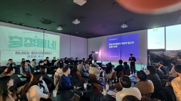 1부 세미나에서는 tvN 스토리 어쩌다 어른과 유튜브에 출연해 메가시티에 대한 이야기로 화제가 된 김시덕 박사가 ‘충청권 메가시티 가능할까?’라는 주제로 기조강연을 하고 이어 전지훈 박사가 ‘충청권 청년 로컬 생태계 연구’에 대한 발표를 했다.