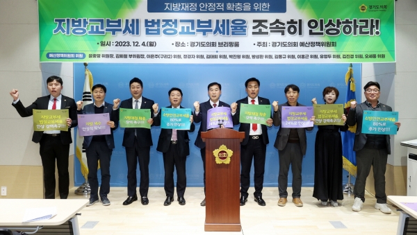 [금요저널] 경기도의회에서는 금일 4일 브리핑룸에서 예산정책위원회 윤종영 위원장을 비롯한 위원들은 ‘지방교부세 인상’을 주요 골자로 하는 법률개정 촉구 결의대회를 개최했다.