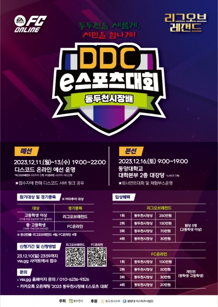 [금요저널] 동두천시가 주최하고 동양대학교 이스포츠사업단이 후원하는 동두천시장배 e스포츠대회가 오는 12월 16일 동양대학교 동두천캠퍼스에서 열린다.