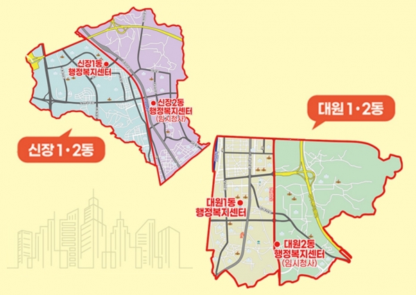 이에 따라 현재 인구 약 6만4천여명의 대원동의 경우 대원1동은 4만5천여명, 대원2동은 1만9천여명으로 나뉘고 인구 약 6만여명의 신장동은 신장1동 3만 6천여명, 신장2동 2만4천여명으로 나뉜다.