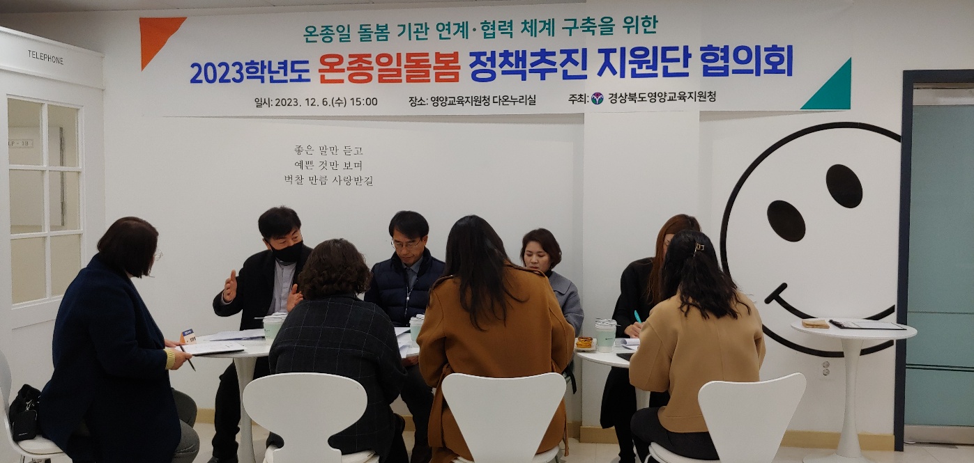 □ 경상북도영양교육지원청(교육장 김유희)은 2023년 12월 6일(수)영양교육지원청 다온누리실에서 2023학년도 「온종일돌봄 정책 추진단」 협의회를 개최하여 아동돌봄사업 추진 사항을 공유하고 지역돌봄 발전 방안에 대해 논의하는 시간을 가졌다.