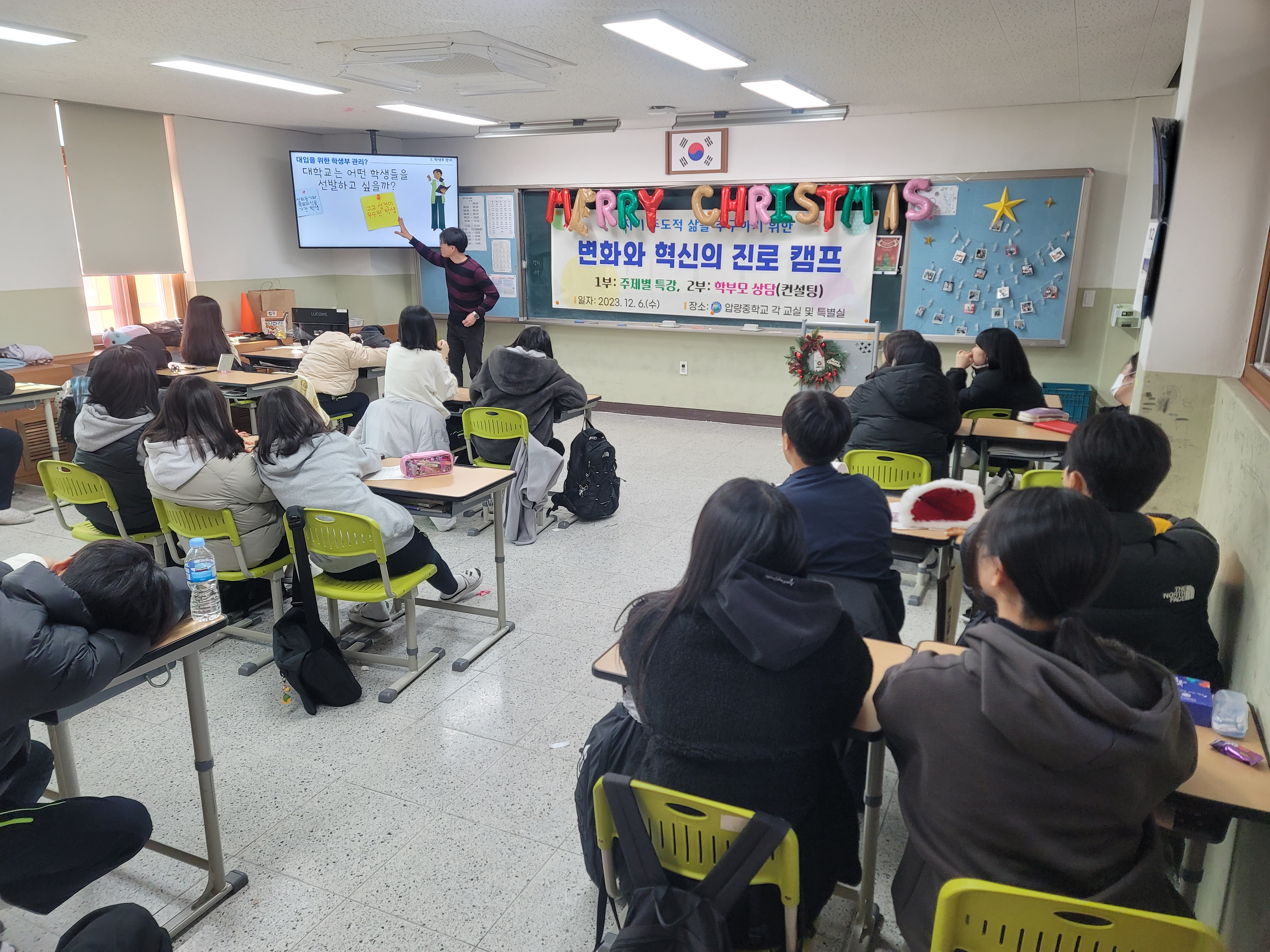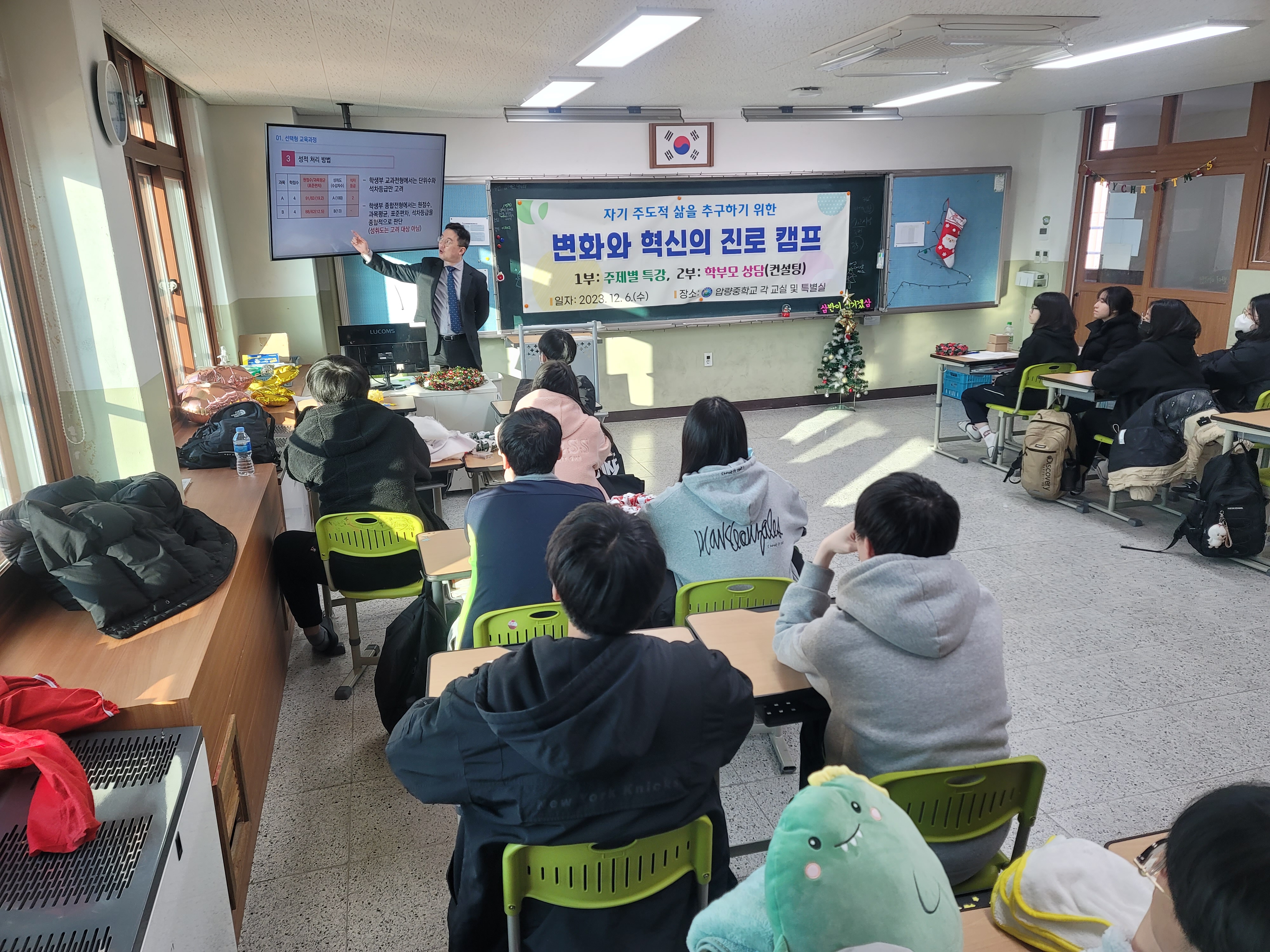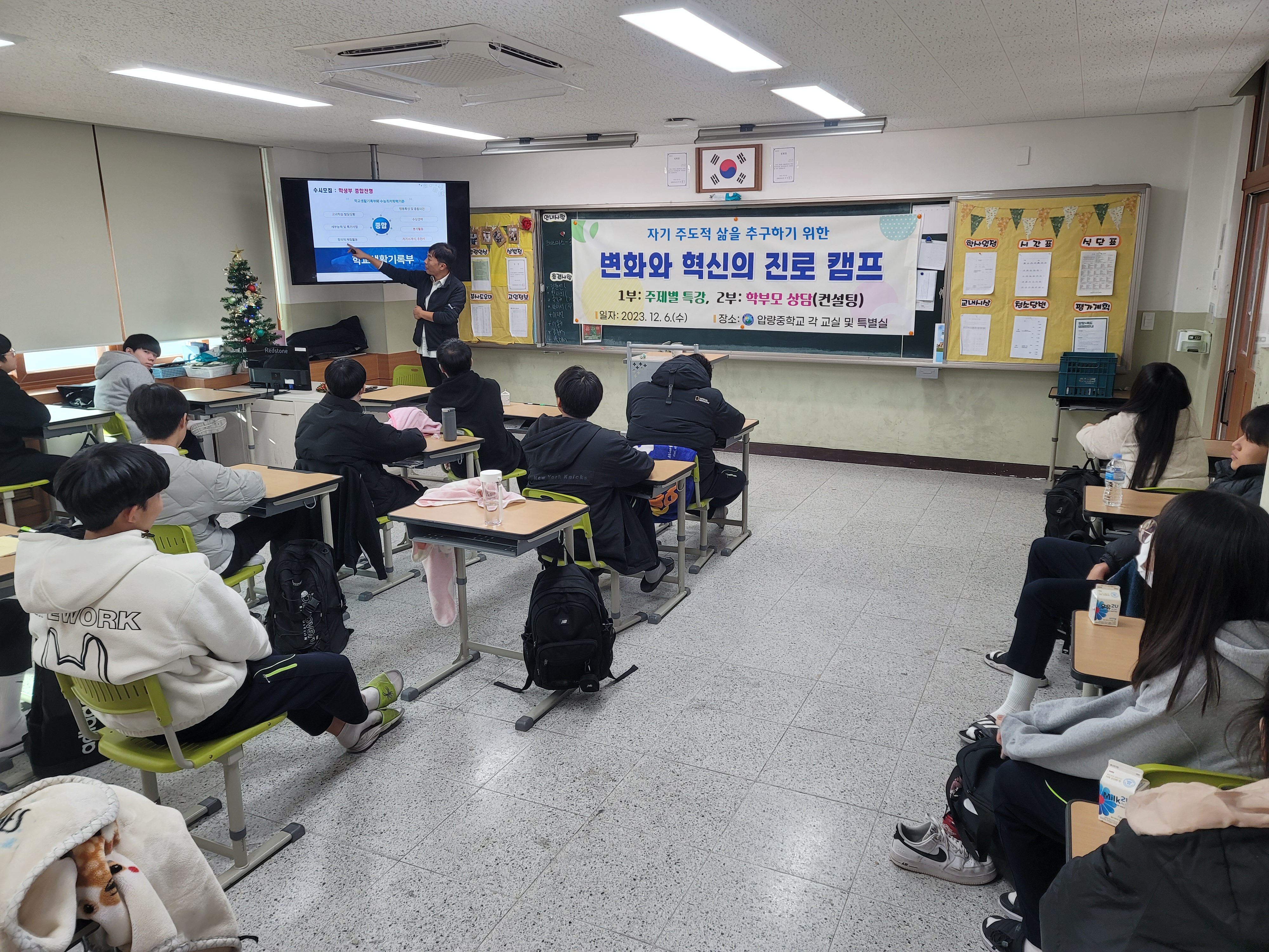 압량중학교(교장 허영선)는 12월 6일(수) 중학교 3학년 학생들과 전체 학부모들을 대상으로 고교학점제, 변화되는 입시체계 등 진로설계와 진학을 위한 주제별 특강프로그램과 자녀와 함께 진로를 고민해보는 자기주도적 삶, 미래설계를 위한 「변화와 혁신의 진로 캠프」를 개최하였다.