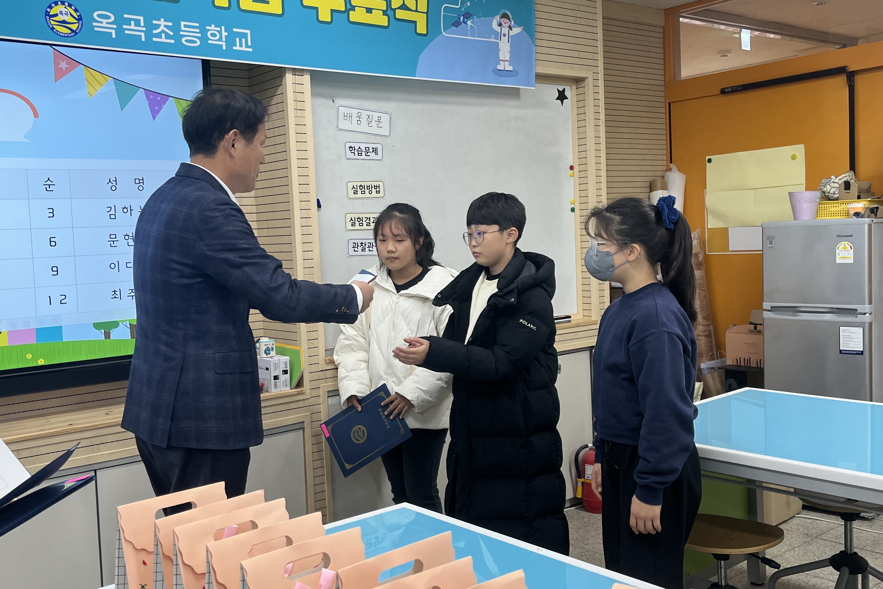 □ 옥곡초등학교(교장 박재휘)는 12월 6일 오후 2시 과학실에서 영재학급 교육 대상 학생과 지도 강사가 참석한 가운데 2023학년도 옥곡초등학교 단위학교 영재학급 수료식을 실시하였다.