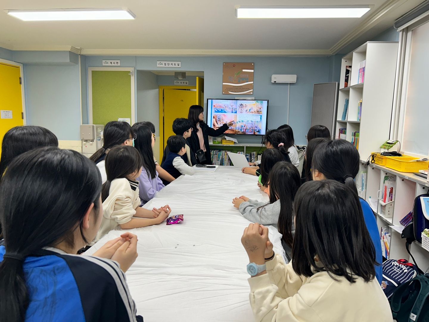 □ 지난 12월 6일 수요일, 글뫼 봉사 동아리는 지역아동센터를 방문하여 책읽기 봉사를 했다. 동아리 학생들은 직접 그림책을 선정하여 역할극을 정하고 지역아동센터 학생들에게 『샌지와 빵집주인』그림책을 읽어주고 토론하였다.