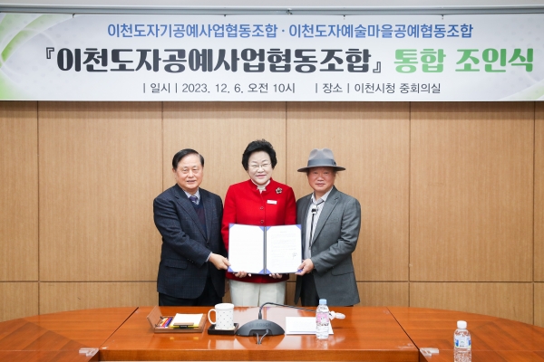 [금요저널] 국내 유일 도자산업특구 도시 이천시의 도예인들이 하나된 목소리로 이천시와 소통하고 지역 도자산업 발전을 도모하고자 ‘이천도자공예사업협동조합’을 설립하기로 하고 지난 12월 6일 이천시청 중회의실에서 ‘이천도자기공예사업협동조합’과 ‘이천도자예술마을공예협동조합’간의 통합조인식을 가지며 새 출발을 알렸다.