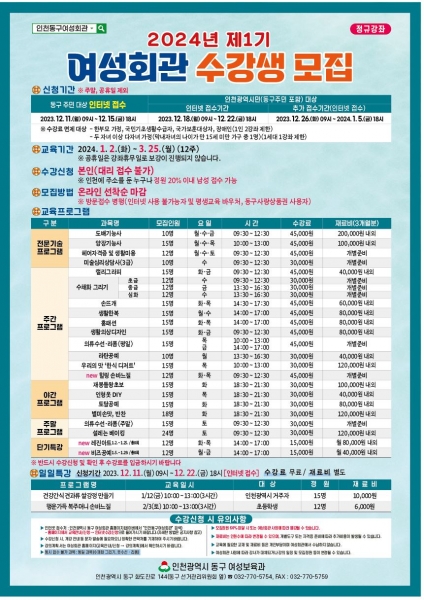인천 동구, 2024년 여성회관 제1기 수강생 모집