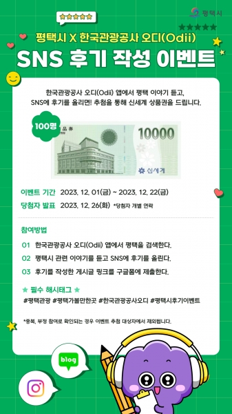참여 방법은 오디 앱에서 평택을 검색 후, 평택시 관련 이야기를 듣고 개인 SNS에 후기를 올리면 참여자 100명을 추첨해 1만원 상당의 모바일 상품권을 제공한다.