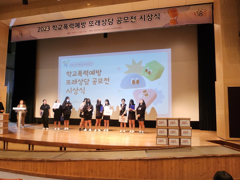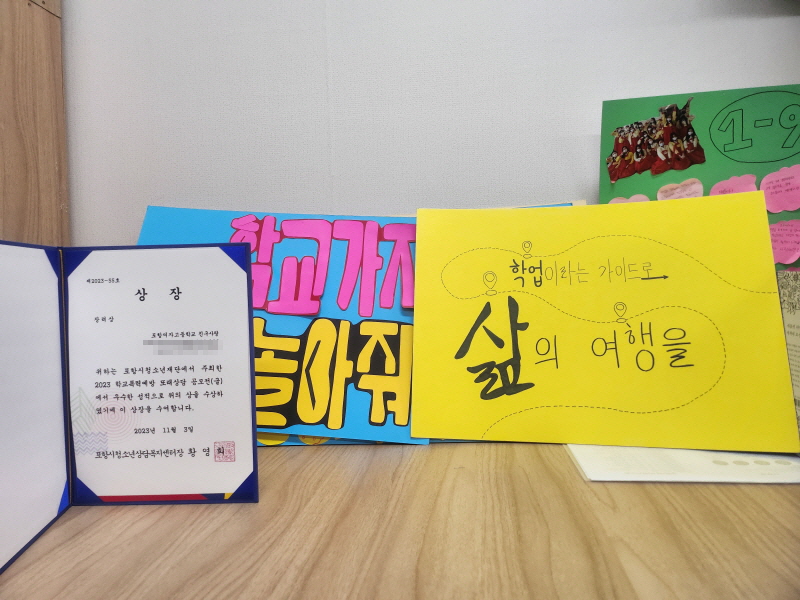 ▢ 포항시 청소년재단에서 주최한‘2023 학교폭력 예방 또래 상담 공모전 시상식’에는 친구사랑(또래상담사) 동아리 학생들이 글(편지쓰기) 부문에서 장려상을 받았으며, ‘2023 2학기 생명 존중 및 학업 중단 예방 석고 방향제 및 캔들 만들기’ 행사를 통해 생명 존중 의식 함양 및 학업 중단을 미리 방지하는 계기가 되었다. 학생 정신건강 증진 학교 운영의 하나로 진행한 ‘2023 생명 존중 및 학업 중단 예방 문구 공모전 및 캠페인’은 반별 생명 존중 및 학업 중단 예방 공모전을 시행하여 당선된 공모 작품 문구를 생명 존중 캠페인 홍보 물품에 인쇄하여 학생들에게 배부하였다.