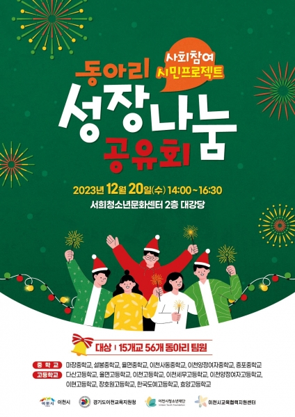 [금요저널] 이천시청소년재단 산하 이천시교육협력지원센터는 오는 12월 20일 서희청소년문화센터 2층 대강당에서 이천시 관내 중·고등학교 중 선정된 15개교 56개 동아리 청소년을 대상으로 “2023년 사회참여 시민프로젝트 동아리 성장 나눔 공유회”를 개최한다.