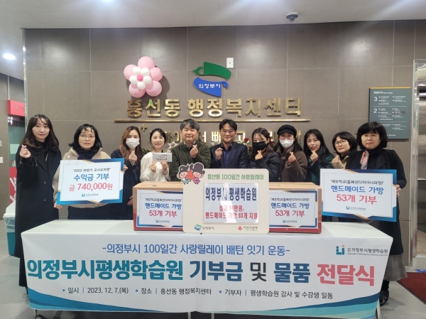 [금요저널] 의정부시 흥선동행정복지센터는 12월 7일 의정부시 평생학습원이 ‘100일간 사랑릴레이 배턴 잇기’의 일환으로 성금 74만원과 핸드메이드 가방 53개를 전달했다고 밝혔다.