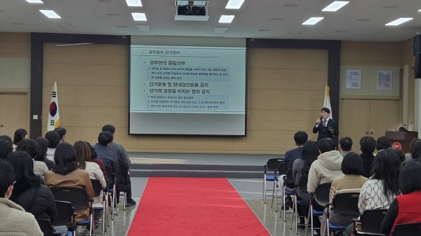 이번 교육은 공무원의 선거 중립 의무와 공직선거법의 제한 금지규정에 대한 명확한 이해를 통해 업무 중 발생할 수 있는 공직선거법 위반행위를 예방하고 공정하고 투명한 선거 분위기를 조성하기 위해 마련됐다.