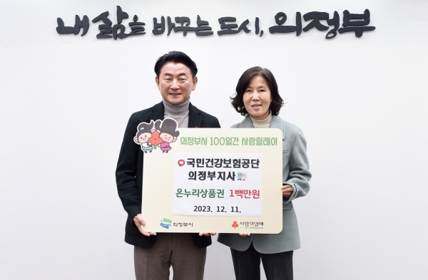 [금요저널] 의정부시는 12월 11일 국민건강보험공단 의정부지사가 ‘100일간 사랑릴레이 배턴 잇기’에 동참해 저소득가구를 위한 온누리 상품권 100만원을 전달했다고 밝혔다.