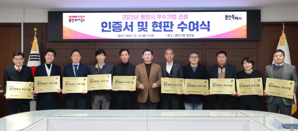 이상일 시장은 지난 12일 시청 접견실에서 이들 기업 대표와 임직원들을 만나 축하와 격려 인사를 나누고 우수기업 인증서와 현판을 전달했다.