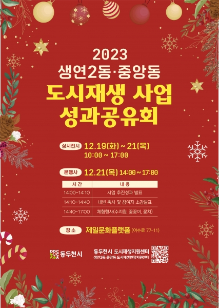 [금요저널] 동두천시는 오는 12월 19일부터 21일까지 동두천시 제일문화플랫폼에서 ‘2023년 생연2동·중앙동 도시재생사업 성과공유회 생중계 성장일지’를 개최한다.