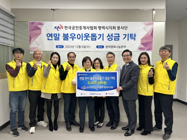 또한 한국공인중개사협회 평택시지회는 “이번 성금은 부동산 경기침체로 회원들이 어려움을 겪고 있는 와중에도 주변 이웃들이 사랑이 넘치는 연말연시를 보내길 소망하는 마음으로 정성을 모아 마련해 그 의미가 남달랐다”고 덧붙였다.